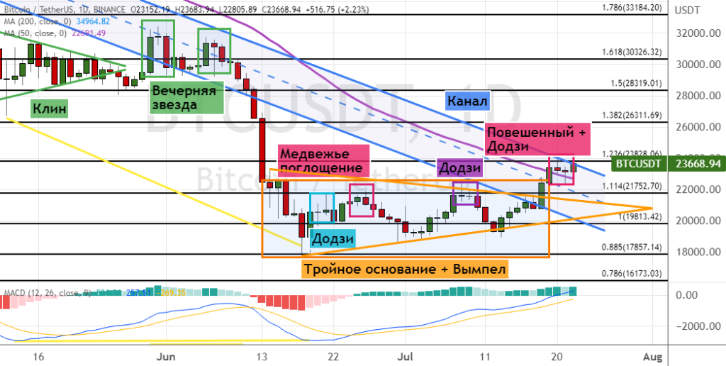 Текущими поддержками для котировок первой криптовалюты выступают уровни $23 000 и $21 800. Между ними также проходит линия 50-дневной простой скользящей средней (SMA). Закрытие дневных свечей ниже уровней поддержки $21 500 и $20 000 приведет к восстановлению медвежьей динамики. Первыми целями здесь выступают уровни $19 000 и $17 800. В пользу реализации этого прогноза все еще указывают такие сигналы, как модели теханализа «Медвежье поглощение», «Додзи» (обозначены линиями фиолетового и бирюзового цвета) и «Клин», а также пробитие нижних границ «Восходящего канала», «Флага» (линии оранжевого цвета) и две свечные комбинации «Вечерняя звезда». Также на графике могут формироваться модели «Повешенный» и «Додзи».