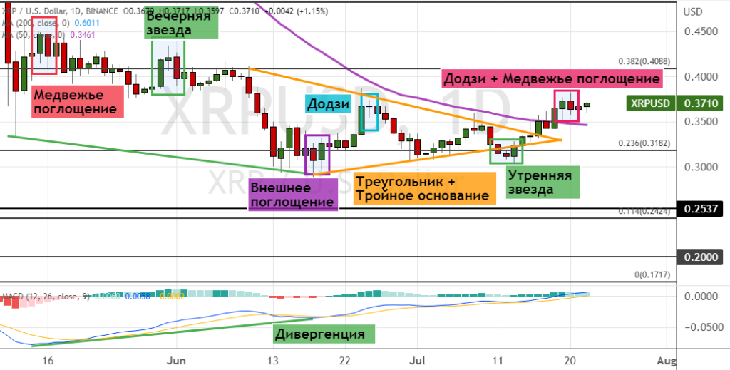 Если стоимость XRP опустится ниже $0.35, это станет сигналом для развития краткосрочной медвежьей динамики. Первыми целями в таком случае выступят уровни $0.32 и $0.3, а также границы кластера $0.24–$0.25. В пользу такого сценария указывают семь сигналов: вероятное формирование моделей «Додзи», «Медвежье поглощение» (обозначены фиолетовым цветом на графике ниже), пробитие нижней границы модели теханализа «Клин», а также модели теханализа «Перевернутый молот», «Додзи», «Вечерняя звезда» и «Медвежье поглощение».