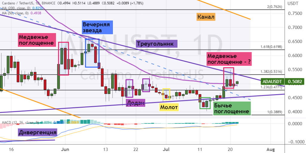 Если дневные свечи закроются ниже уровней $0.48 и $0.5, между которыми проходит линия 50-дневной SMA, это станет сигналом о развитии краткосрочной медвежьей динамики. Первыми целями для котировок ADA в этом случае выступят поддержки на уровнях $0.45, $0.4 и $0.35. В пользу такого движения указывают шесть сигналов: возможное формирование модели «Медвежье поглощение» (обозначена фиолетовым цветом), две модели теханализа «Додзи», а также модели «Перевернутый молот» (обозначена зеленым цветом), «Медвежье поглощение» (обозначена красным цветом) и «Вечерняя звезда» (обозначена синим цветом).