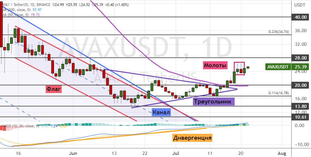 При этом уход котировок AVAX ниже уровня поддержки $24 приведет к снижению до первых целей $20, $17, $15 и $13.80. В пользу сценария на понижение указывает возможное формирование двух моделей теханализа «Молот» (обозначены фиолетовым цветом).