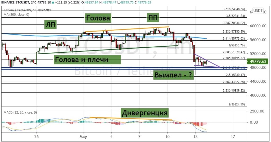 В результате 14 мая котировки BTC снизились к границам консолидации $47 400–$48 000, которая сейчас выступает поддержкой. От этих уровней биткоин возобновил рост к сопротивлению $50 200, которое он преодолел. Следующим важным сопротивлением станет уровень $51 900. Однако сейчас котировки BTC, возможно, формируют модель «Вымпел», которая в случае реализации опустит биткоин к поддержкам на $45 300, $43 300, $40 900 и $36 800.