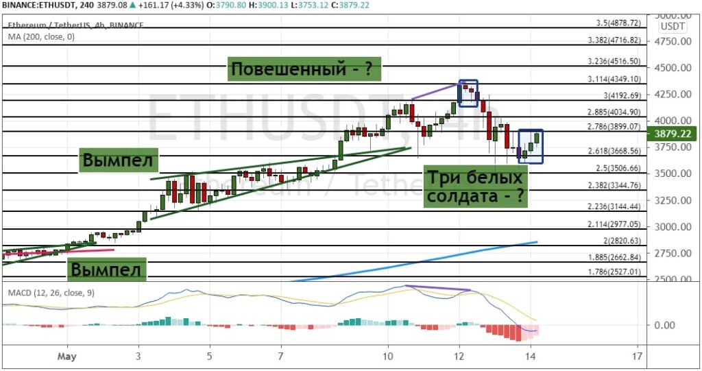 Медвежий сигнал в виде свечной комбинации «Повешенный» и дивергенция между ценами на графике и осцилляторе MACD стали поводом для снижения котировок эфира ниже $3 670 и $3 500. Однако от этих уровней ETH возобновил рост.