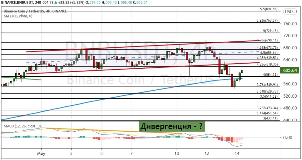 Котировки Binance Coin пробили нижнюю границу «Восходящего канала», представленного на графике ниже. Сигналами, указывающими на реализацию этого сценария, стали дивергенция между ценами на графике и осцилляторе MACD (представлена на графике ниже) и свечная комбинация «Медвежье поглощение». Это позволило BNB снизится до уровней $550 и $530.