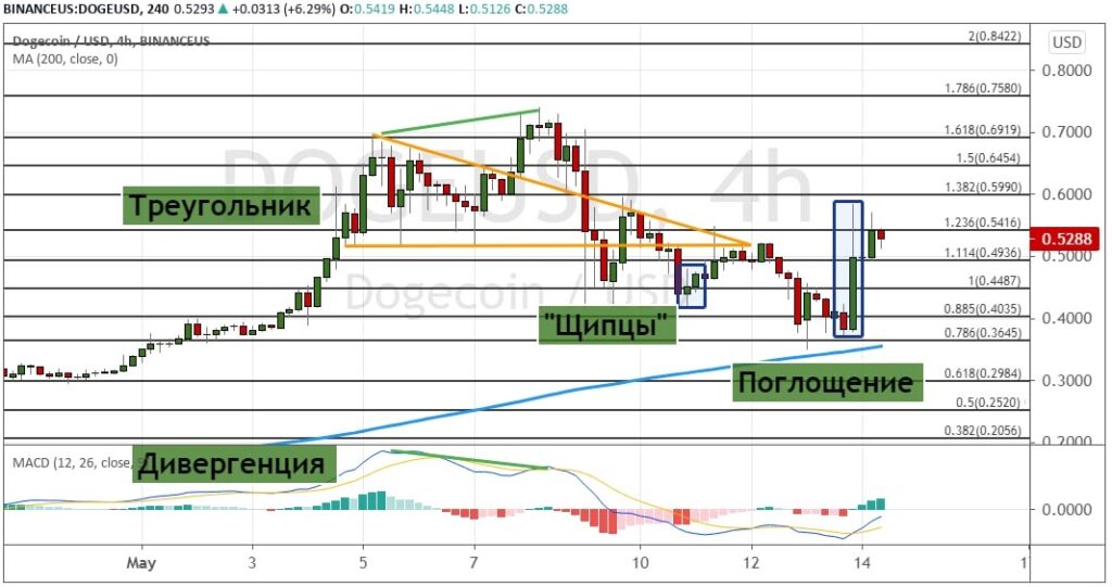 DOGE — один из немногих активов крипторынка, который смог показать стремительный рост от уровней $0.36 и $0.40, где проходит линия 200-дневной SMA. Сигналом о росте также послужила свечная комбинация «Поглощение», которая представлена на графике ниже.