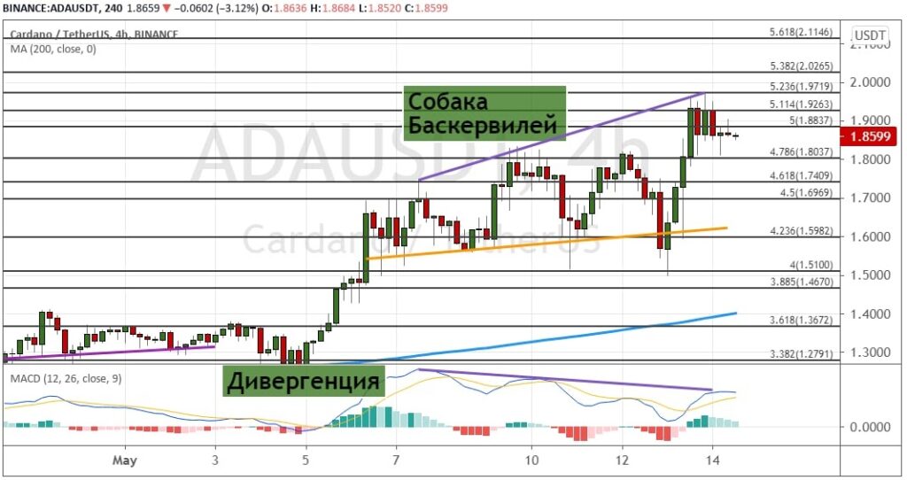 ADA уверенно вернулась в рейтинг топ-5 криптовалют по капитализации. Котировки ADA поднялись до цели $1.90 после того, как смогли преодолеть максимум в районе $1.80. Это движение происходило в рамках реализации довольно редко встречающейся модели теханализа «Собака Баскервилей». Дальнейший рост может привести к достижению среднесрочных целей на уровнях $2.00, $2.03, $2.11, $2.25 и $2.5.