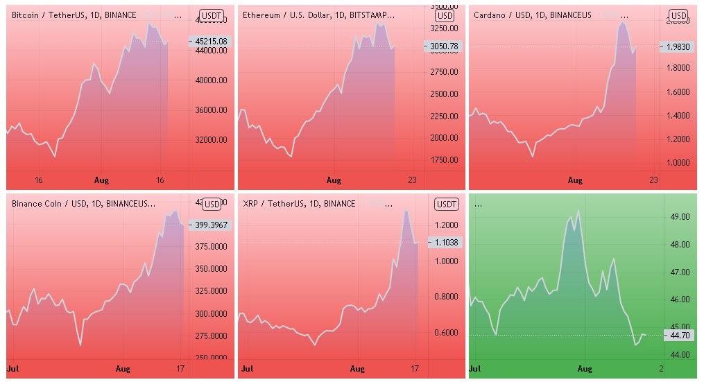 Динамика котировок BTC, ETH, BNB, ADA, XRP (дневной таймфрейм) и график доминации биткоина. Источник
