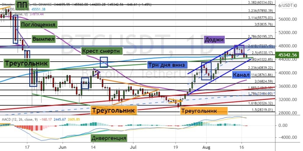 На графике ниже можно отметить, что попытка биткоина закрепиться ниже $46 500 и $45 300, где также расположена граница «Восходящего канала» (обозначена синим цветом на графике ниже) завершилась.