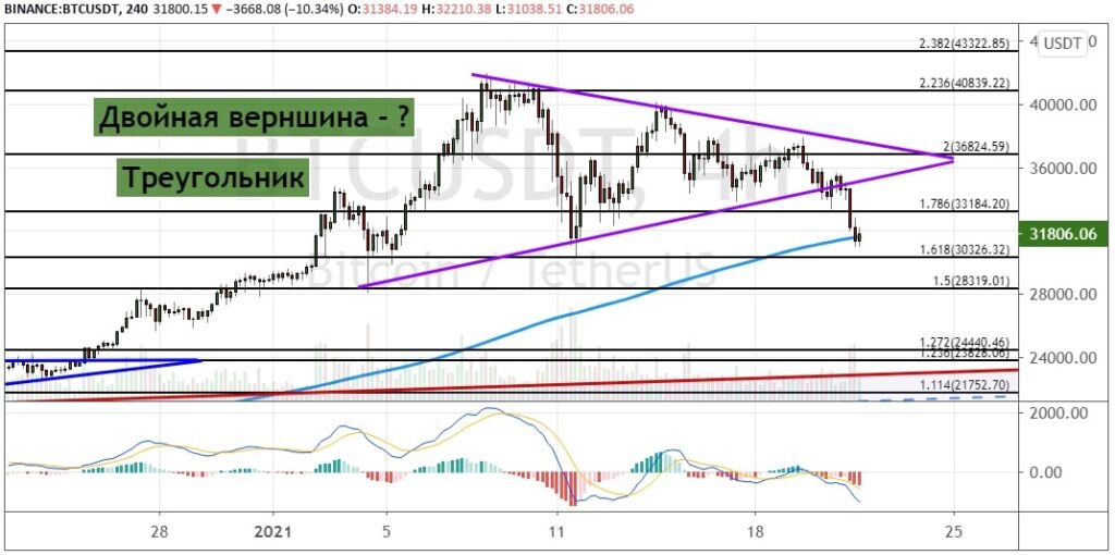 К концу недели биткоин начал демонстрировать вполне ожидаемую коррекцию. Это привело к прорыву нижней границы модели теханализа «Треугольник» и линии поддержки на уровне $33 180 (78,6% коррекция по уровням пропорции Фибоначчи).