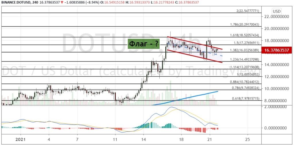 Котировки DOT в отличие от многих криптовалют пока стремятся сохранить восходящий тренд. Сейчас стоимость DOT пытается преодолеть верхнюю границу модели теханализа «Флаг», а на графике ниже можно наблюдать ретест этой линии. Это вновь может привести к прорыву сопротивления на уровне $17.30 (50% расширение по уровням Фибоначчи). В перспективе среднесрочными целями последовательно выступят сопротивления на уровнях $18.50, $20.30, $20.50 и $25.