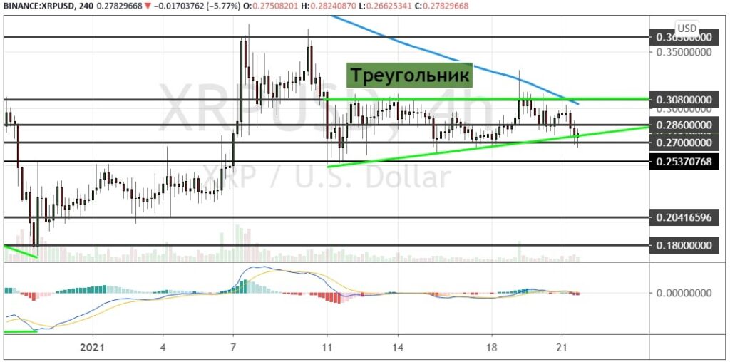 Рипл продолжает движение в рамках модели теханализа «Восходящий треугольник». Прорыв нижней границы этой модели и области $0.27 – $0.2860 станет сигналом для снижения к первой цели, расположенной на линии поддержки $0.2540. Сохранение импульса позволит рипл последовательно протестировать поддержки на $0.2360, $0.20 и $0.1480.