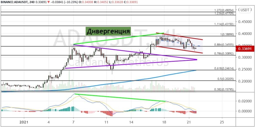 Монета ADA после прорыва границы модели теханализа «Треугольник» продолжила развитие консолидационного движения между уровнями текущей поддержки $0.3450 и сопротивления в виде области $0.3940 – $0.40.