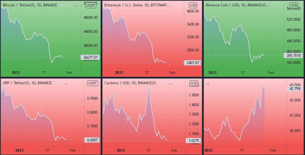 Динамика котировок BTC, ETH, ADA, BNB, XRP (дневной таймфрейм) и график доминации биткоина. Источник