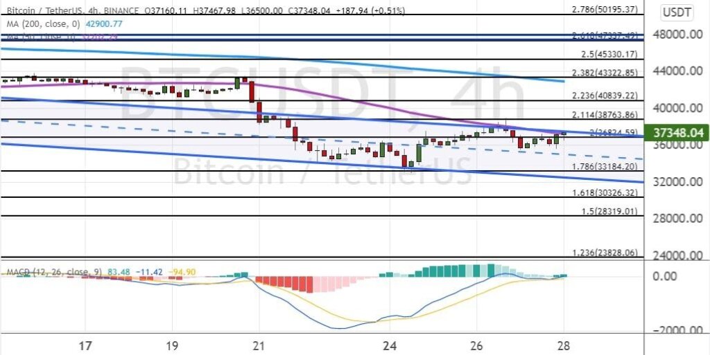 Котировки BTC продолжают движение в районе ключевого уровня $36 800, где проходят верхняя граница модели теханализа «Нисходящий канал» (обозначена на графике ниже линиями синего цвета) и 50-периодная простая скользящая средняя (SMA).