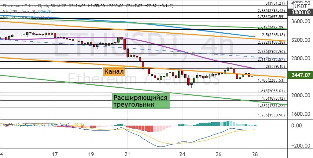 Котировки ETH двигаются в районе нижней границы модели теханализа «Нисходящий канал» (обозначена на графике ниже линиями оранжевого цвета). Текущая линия поддержки расположена на уровне $2 280, а сопротивления — на $2 580, где также проходит 50-периодная SMA.