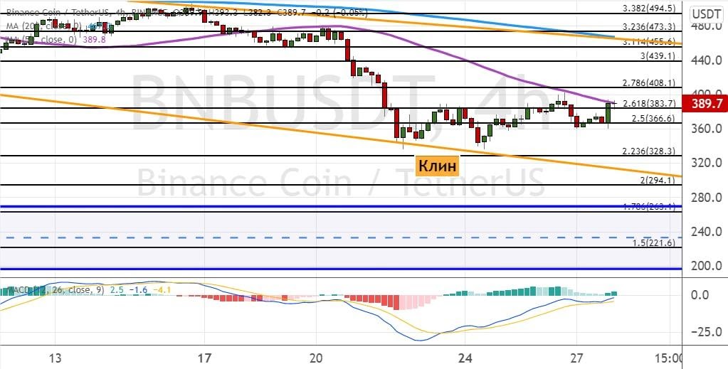 На графике BNB можно отметить попытки быков преодолеть уровень сопротивления $380, где расположена линия 50-периодной SMA, однако пока они остаются безуспешными. Тем не менее если быкам все же удастся не только пробить сопротивление, но и закрепиться выше $410, это позволит стоимости BNB продолжить рост до $440 и $455, где расположены верхняя граница фигуры теханализа «Клин» (на графике ниже обозначена линиями оранжевого цвета) и линия 200-дневной SMA.
