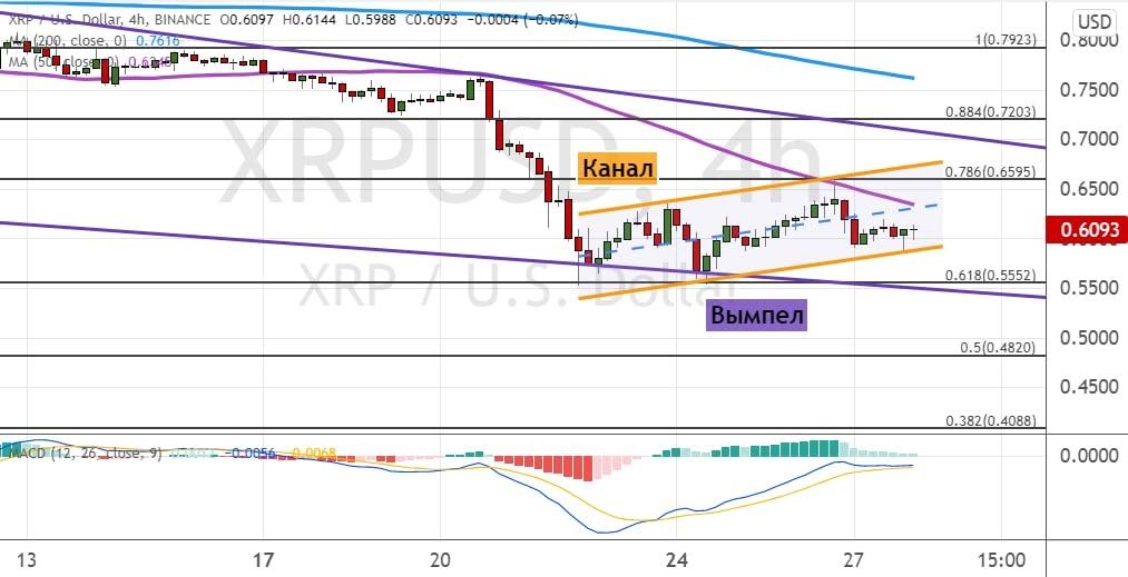 Котировки XRP движутся в границах модели теханализа «Нисходящий канал» (обозначен на графике ниже линиями оранжевого цвета). Текущими поддержками выступают уровни $0.60 и $0.55, где также проходит нижняя граница модели теханализа «Вымпел» (обозначена на графике ниже линиями фиолетового цвета). Сопротивлением для текущих котировок альткоина выступают уровни $0.63, где проходит линия 50-периодной SMA, и $0.66.