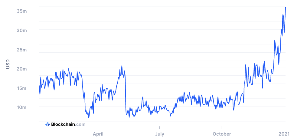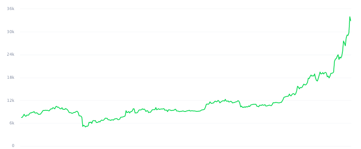 В первые дни нового года биткоин продолжил бить рекорды. 3 января курс монеты достиг максимума в $34 480 и капитализации в $640 млрд.