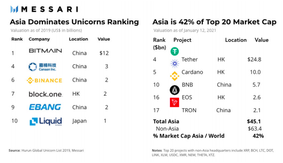 - 6 из 10 самых дорогих криптокомпаний: Bitmain, Canaan, Binance, Block.One, Ebang, Liquid. В регионе расположены главные офисы эмитентов Binance Coin, Tether, Cardano, Tron, а также криптобирж Binance, Huobi, OKCoin и Okex;