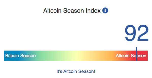 Также можно воспользоваться индексом Altcoin Season Index, который отслеживает котировки топ-50 криптовалют по капитализации. Если 75% из них три месяца подряд приносят большую доходность, чем биткоин, то индекс сезона альткоинов идет вверх. И сейчас он находится на 92 из 100 пунктов.