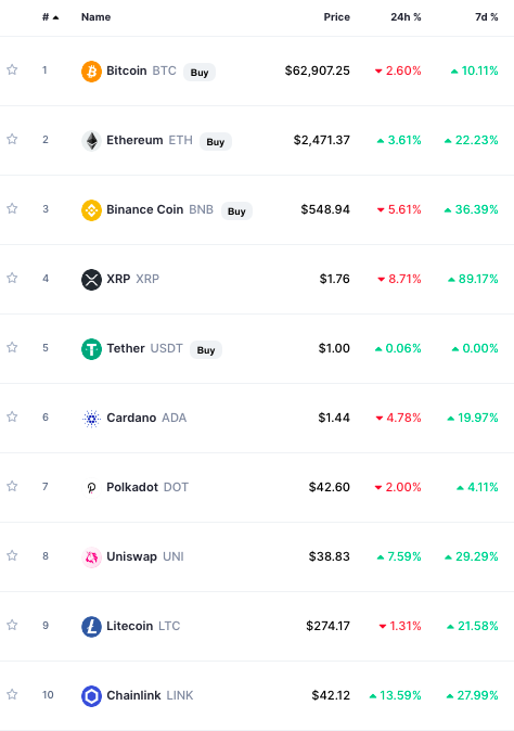 Однако теперь, когда курс первой криптовалюты резко превысил $60 000, (а 14 апреля и вовсе подобрался вплотную к $65 000, обновив свой исторический максимум) большинство крупнейших по капитализации альткоинов показывают меньший, чем биткоин, рост за сутки либо не сильно его превышают.