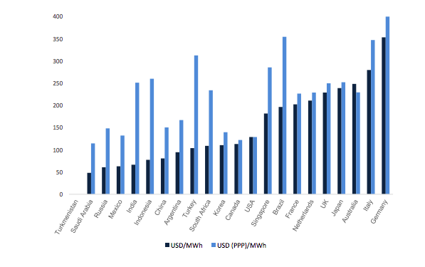 Цены на электроэнергию сильно разнятся. Средняя стоимость электричества в России — $0.07−$0.08/кВт⋅ч, при этом в Сибири она еще ниже — $0.04/кВт⋅ч. Средняя цена в мире — $0.15/кВт⋅ч. Многие страны, в том числе РФ, устанавливают более низкую цену за промышленную электроэнергию, чтобы стимулировать экономический рост. На практике это означает, что майнинговая ферма в России будет платить в два раза меньше за электроэнергию, чем, например, в США.