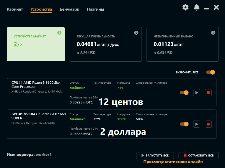 Но можно ли и сегодня майнить криптовалюты на центральном процессоре или видеокарте? Можно. С помощью CPU и GPU можно майнить многие криптовалюты. Например, эфир можно добывать с помощью видеокарт, только их память должна быть от 6 Гб или больше. Вы можете майнить криптовалюты даже на центральном процессоре. Например, доходность карты Nvidia GeForce GTX 1660 Super (6 Гб памяти) колеблется в диапазоне $2–$3. А процессор AMD Ryzen 5 1600 AF дает 12 центов: