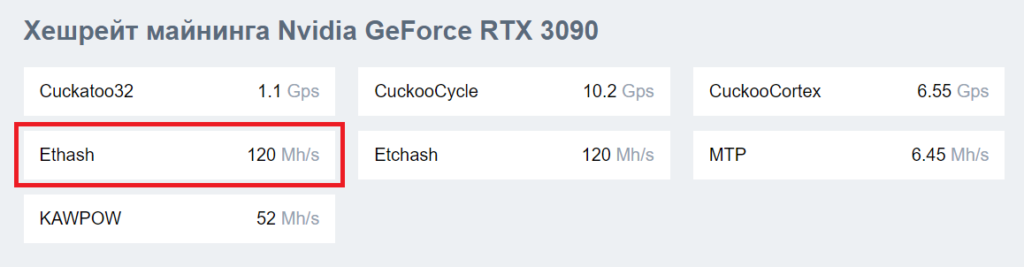 А теперь взглянем на показатели самой топовой видеокарты на данный момент — Nvidia GeForce RTX 3090 с памятью 24 Гб. Она дает 120 Mh/s (120 млн хешей, не трлн, не млрд, а именно млн) при потреблении до 350 Ватт/ час.