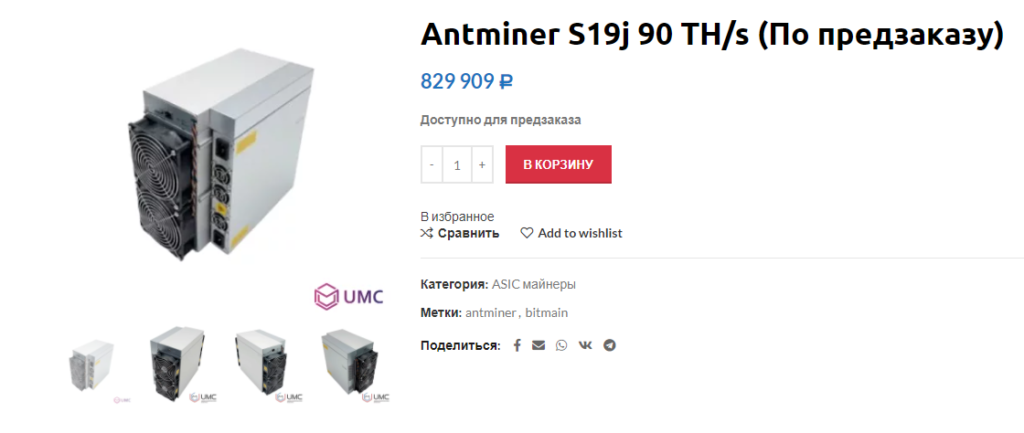 Второй способ — это перекупщики. Кто-то закупает оборудование напрямую у производителя, а затем занимается перепродажей. Цены, очевидно, намного выше. Например, прямо сейчас можно купить S19J 90 Th/s за почти $11 000.