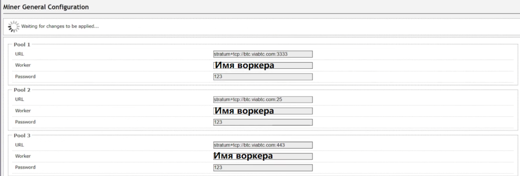 Здесь осуществляется непосредственная настройка майнеров. Пул 1, пул 2 и пул 3 — это поля, который нужно будет заполнить в админке асика (далее поясним, о чем идет речь).