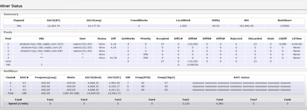 Сохраняем настройки. После этого асик перезагрузится и уже будет майнить биткоин на пуле Via BTC. Собственно, все.