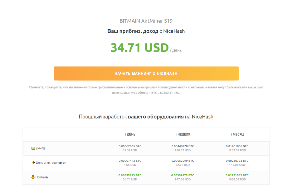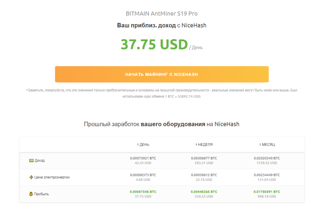 Как правило, оборудование для майнинга всегда продается с окупаемостью в 8–10 месяцев. Но что если вы купите оборудование сейчас за $11 000, а курс упадет вдвое? Согласно данным NiceHash, при использовании AntMiner S19 PRO вы сможете получить $37.75 в день.