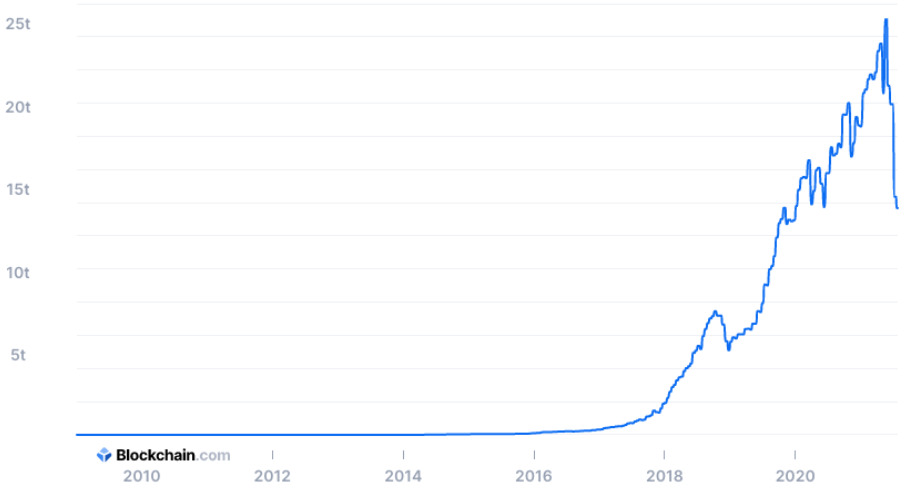 Сложность майнинга измеряется в хешах. При запуске биткоина в 2009 году она составляла около 1 хеша — для добычи монет было достаточно простого ноутбука. Сейчас этот показатель уже измеряется триллионами хешей.