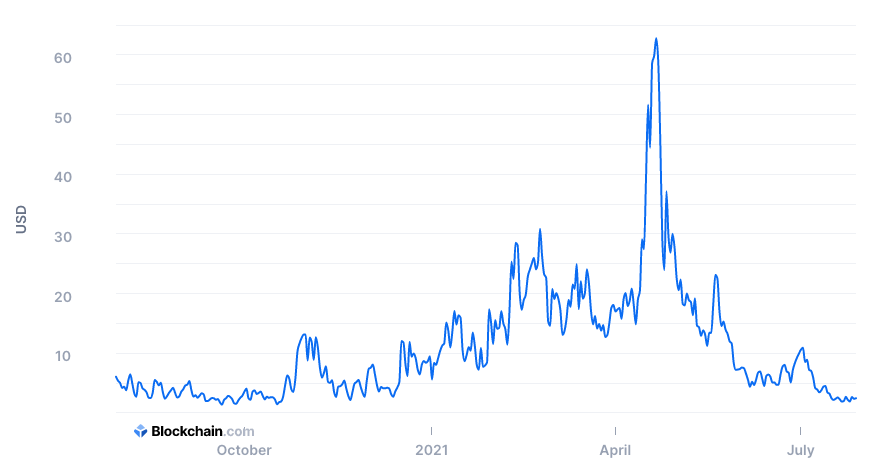 График изменения средней комиссии в сети Bitcoin в долларах в течение года. Источник