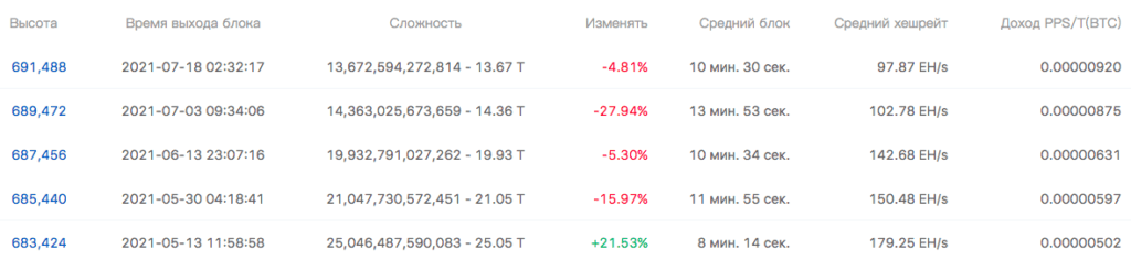 Пять последних корректировок сложности майнинга биткоина. Источник