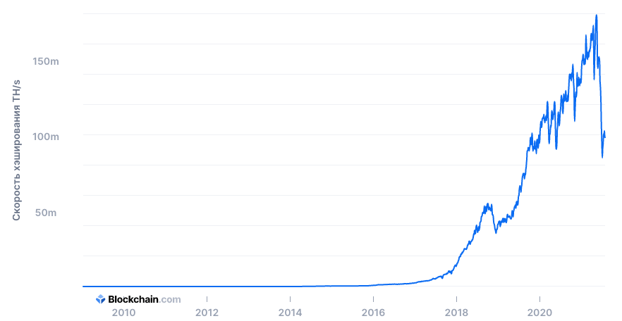 В мае этого года хешрейт Bitcoin достиг своего максимума почти в 180 EH/s, а начале июля опустился до 84.7 EH/s — это минимум с августа 2019 года и рекордное падение мощности сети (на 54%). Сейчас хешрейт поднялся до 102.9 EH/s.