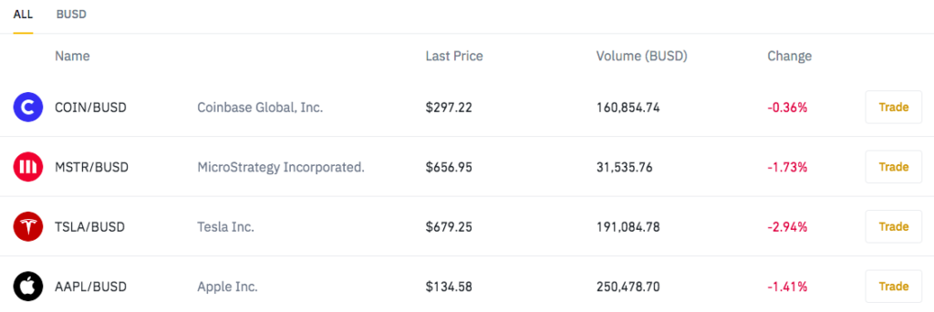 Binance. 12 апреля крупнейшая криптобиржа добавила торговлю акциями Tesla и с тех пор постепенно расширяет выбор активов: сейчас на площадке можно также купить токенизированные акции Apple, Coinbase, MicroStrategy и Microsoft. Все торги проходят в паре с BUSD — собственным долларовым стейблкоином биржи.