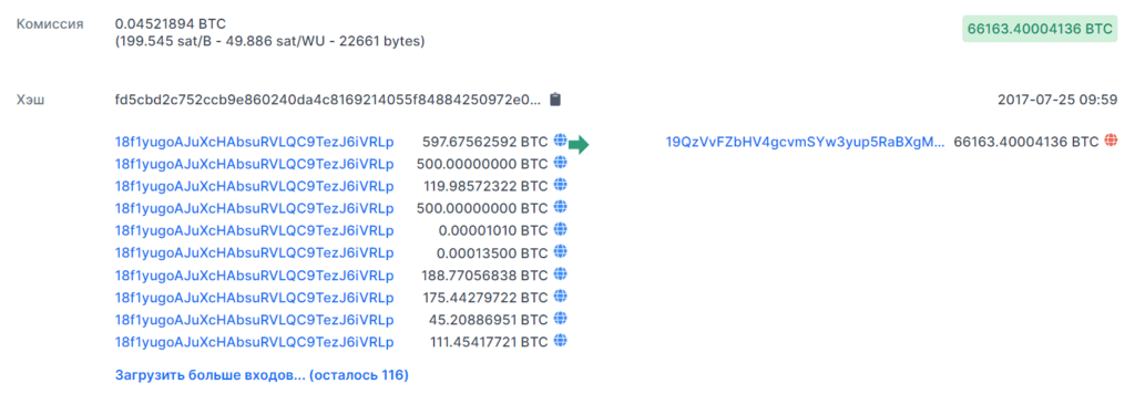 Перевод более 66 000 BTC в июле 2017 года. Источник