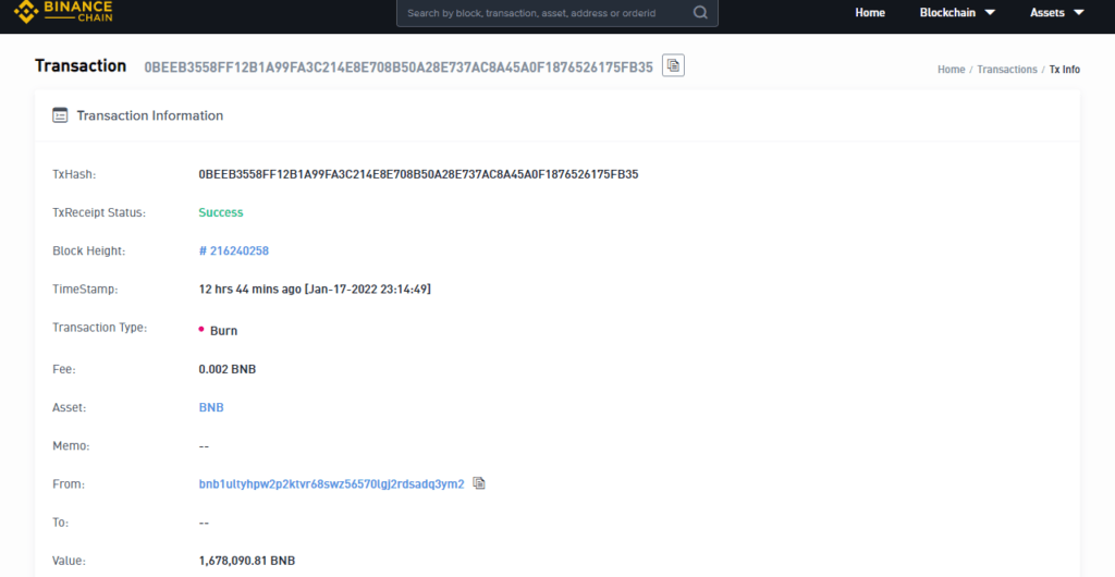 Всего были сожжены 1 684 387 BNB ($800 млн), 6 296 BNB из которых — в рамках программы Pioneer Burn, она учитывает BNB, ошибочно отправленные на неактивные адреса.