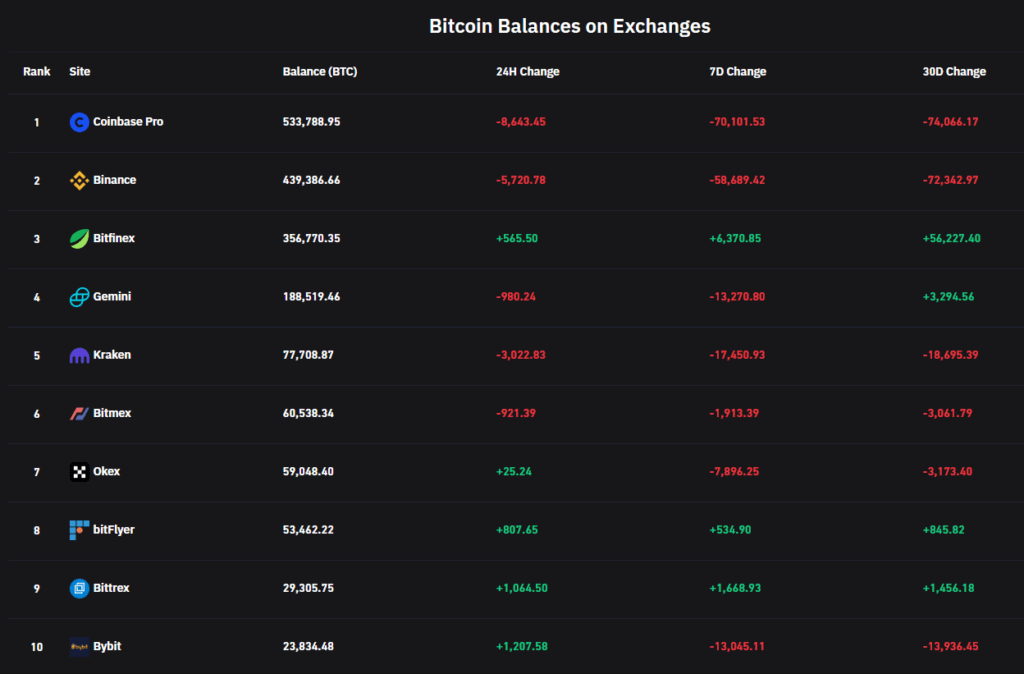 Вывод средств с криптобирж является трендом последних нескольких дней. После краха FTX пользователи начали беспокоиться о своих активах и переводить их на собственные адреса, которые они контролируют самостоятельно. Согласно данным Coinglass, за последнюю неделю с бирж было выведено почти 200 000 BTC, в результате чего количество биткоинов, хранящихся на биржах, снизилось до 1.88 млн BTC. Coinbase, Gemini и Kraken фиксируют такой же отток BTC в процентном соотношении, что и Binance.