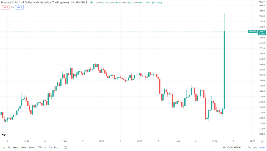 Рынок отреагировал ростом на эту новость. Биткоин подскочил на $1 000 до $20 500, но более сильную динамику показал BNB (+22%).