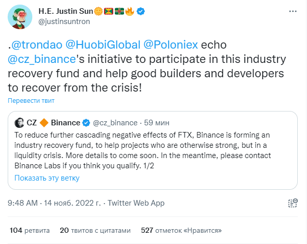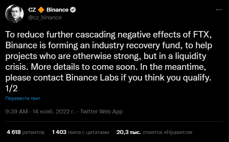 «Чтобы уменьшить дальнейшее каскадное влияние FTX, Binance формирует фонд для восстановления отрасли с целью помочь проектам, которые сильны, но переживают кризис ликвидности». Источник