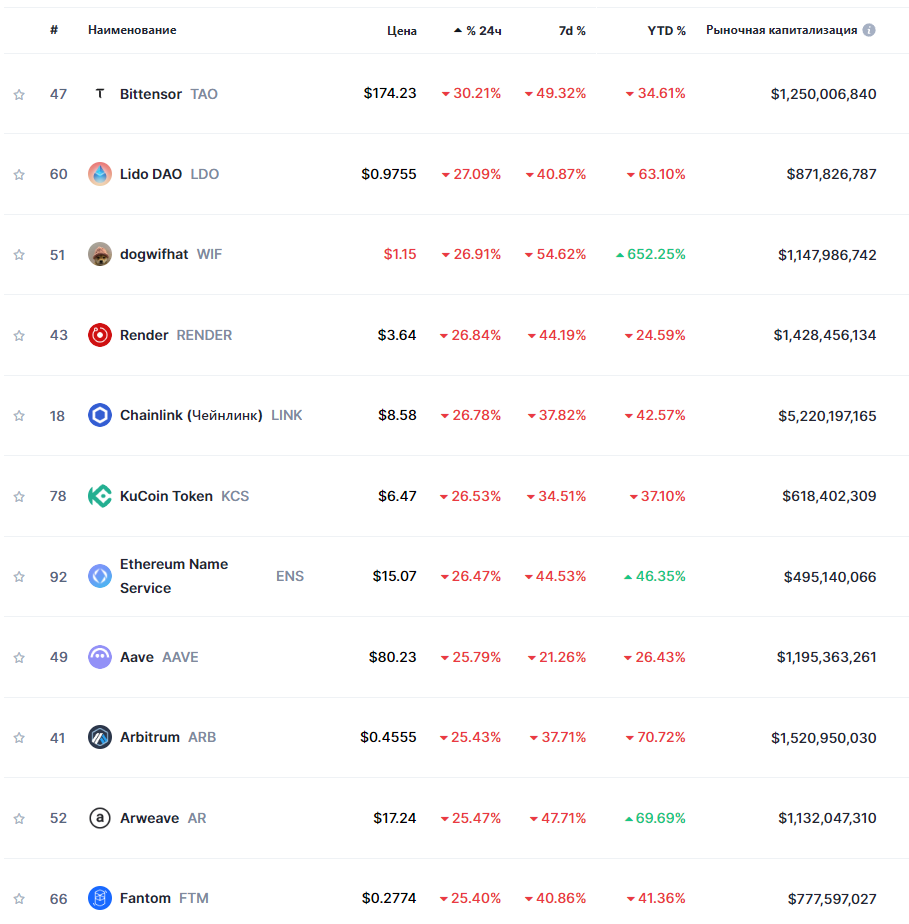 Эфир в моменте падал к отметкам около $2 100, потеряв в цене 22% за последние сутки и 32% за неделю. Многие альткоины из топ-100 упали на 20–30%.