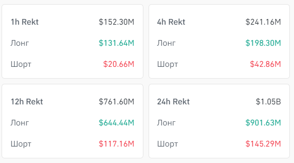 Объем ликвидаций маржинальных позиций за сутки превысил $1 млрд, более $900 млн из этой суммы составляют сделки в лонг.