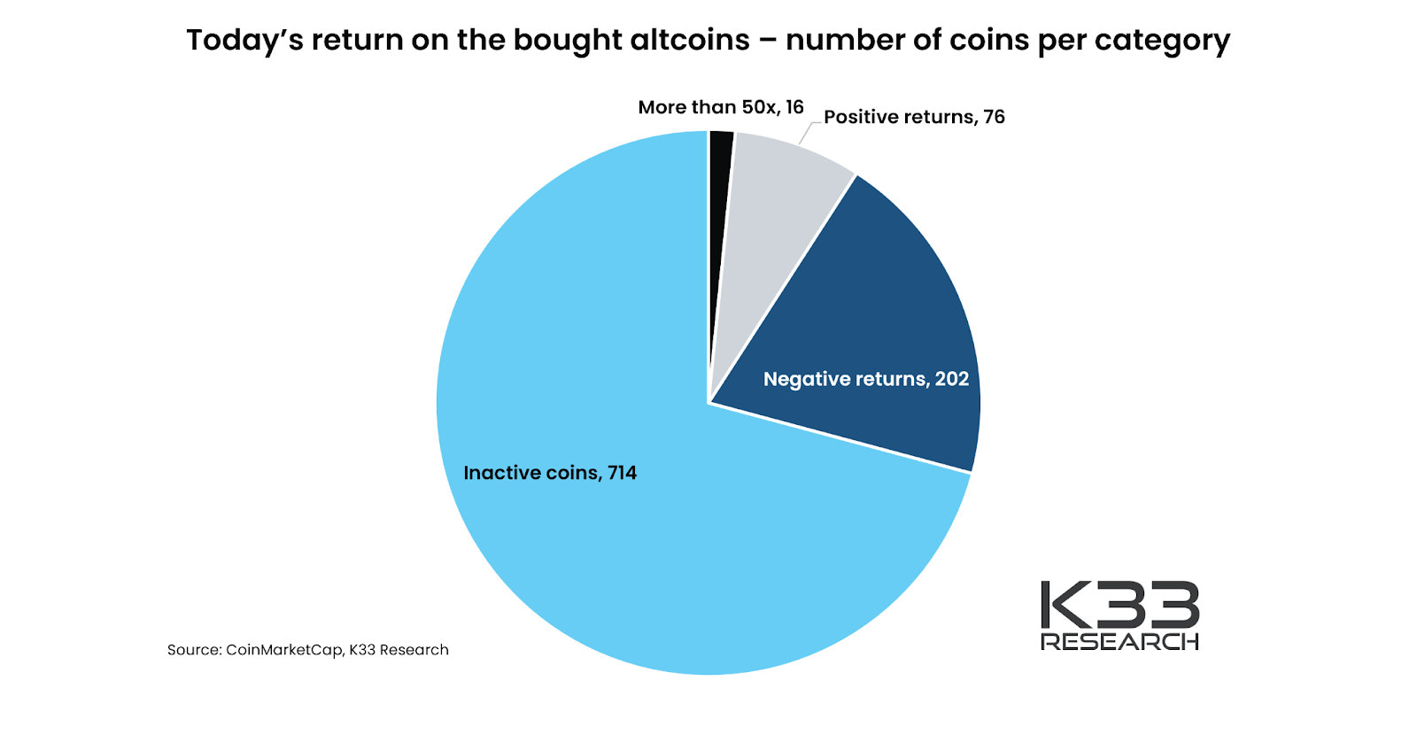 Аналитики K33 Research проанализировали эффективность инвестиций в размере $1 в 1 009 альткоинов с 2015 года в тот момент, когда те вошли в топ-100 рейтинга по рыночной капитализации. Аналогичная сумма инвестиций бралась и для биткоина. Эксперты пришли к выводу, что портфель из альткоинов сегодня стоил бы около $7 000, в то время как инвестиции в биткоин оценивались бы в $50 000.