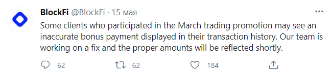Зачисления производились в рамках рекламной кампании, которую проводила BlockFi. Предполагалось, что пользователям, которые с 18 по 31 марта проведут определенное количество операций на платформе, выплатят бонусы в стейблкоине GUSD до 31 мая.