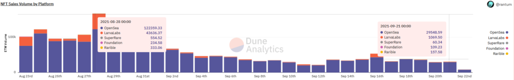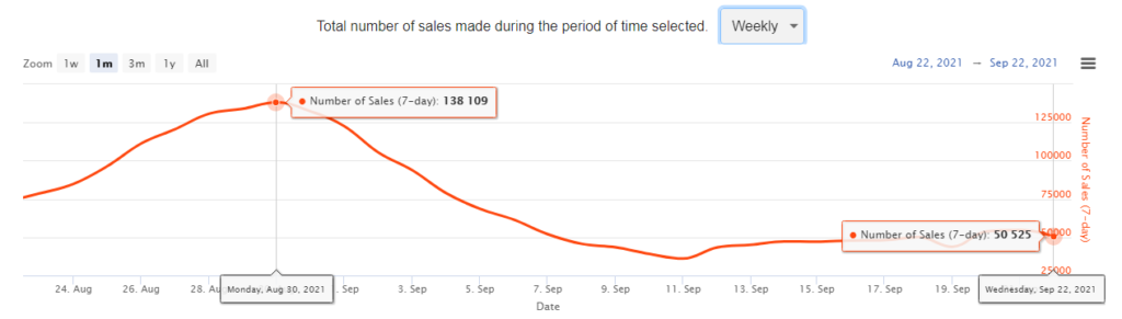 Негативная динамика прослеживается и по показателю количества сделок на торговых площадках, который по данным Nonfungible снизился со 138 тысяч в конце августа до 50 тысяч на сегодняшний день.