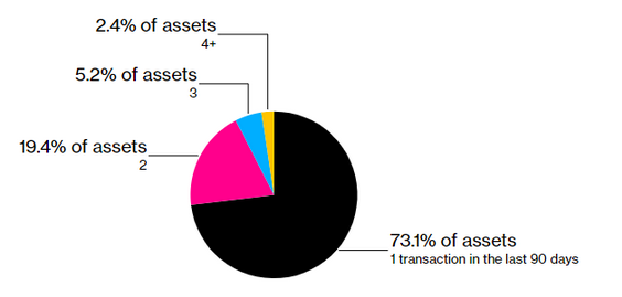 Доля активов с различным числом транзакций на OpenSea. Источник.