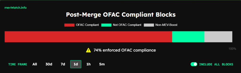 Цель этапа Scourge заключается в том, чтобы обеспечить «надежное и достоверно нейтральное включение транзакций в блок, избежать централизации и других рисков протокола, связанных с MEV». MEV расшифровывается как Maximal Extractable Value (максимально извлекаемая стоимость) — это способ получения валидаторами дополнительной прибыли за счет изменения порядка транзакций в блокчейне. Такая практика считается недобросовестной, тем не менее активно применяется в сети Ethereum. Согласно данным mevWatch, за последние сутки 74% блоков в сети Ethereum цензурировались, то есть некоторые валидаторы не добавляли определенные транзакции в блокчейн.