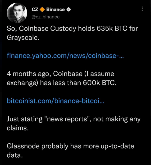 «Итак, Coinbase хранит 635 000 BTC для Grayscale. А в новости четырехмесячной давности говорится, что у Coinbase менее 600 000 BTC. Я просто привожу данные из новостных СМИ. Возможно, есть более свежие данные», — говорится в сообщении CZ, которое уже было удалено.