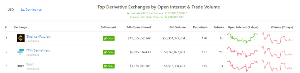 По данным CoinGecko, за последние сутки объем торгов на трех крупнейших криптобиржах, предлагающих торговлю деривативами (Binance, FTX, Bybit), составил более $25 млрд.